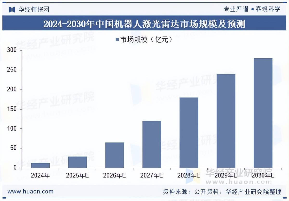 AI浪潮的持续演进将深化具身智能发展。除传统人形机器人厂商外,多家科技巨头亦加速布局。人形机器人量产进程的提速,将拉动机器人激光雷达市场增长。预计2030年我国机器人激光雷达市场规模将达到280亿元,2024至2030年期间复合年增长率预计为67%。